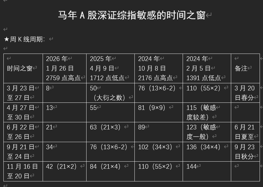 从周K线的周期上分析,2026年1月26日至30日分别是深证综指2025年10月2557点、2024年10月2176点两个波段高点以来的第16(8×2)、68(34×2)周,同时分别是2025年4月1712点、2024年2月1391点两个波段低点以来的第42(21×2)、102(34×3)周。因此,2026年1月26日至30日这周是比较敏感的时间之窗。