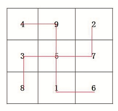 2)通过中数5的纵向、横向或对角线上的三个数,数5与其它两数之差的绝对值相等。